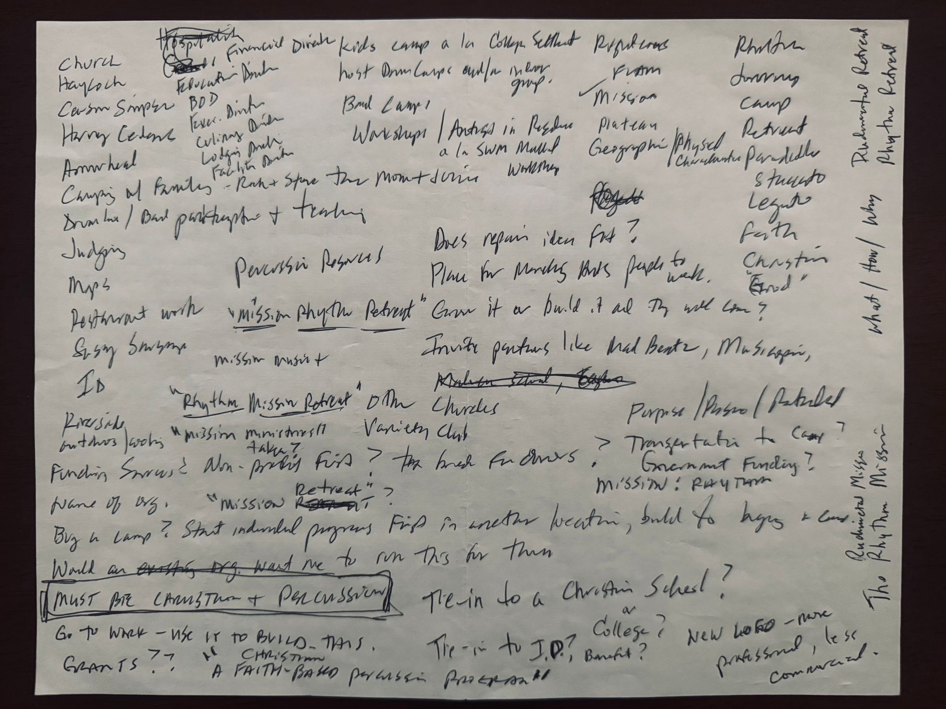 I was on a men's retreat in the Pocono mountains with our Men's Ministry leadership team in November of 2022. We were asked to find a quiet place to complete a worksheet that was intended to explore ourselves toward the goal of finding our calling in life. We were to do it alone and had 45 minutes to complete about 8-10 questions. I began the worksheet and on the very first question I listed answers about times and places, jobs or activities that I can look back on and categorize as bringing me joy. Simple, right? I made a list, band stuff, church, camps/retreats, cooking, and a few other things. I didn't even get to the next question when I looked at my list and thought "is there any job I could do that would involve all of these things, and the aspects of them, that I was describing as bringing me joy?" Again...duh, so simple. I proceeded to start to scribble ideas, names of a would-be company or service, programs we could offer, ways to fundraise, big plans to open a camp for kids some day, all with a percussion theme. I literally couldn't stop from wriitng as tons of ideas flooded my thoughts! I scribbled all over the back of the first page of the worksheet that I was supposed to be completing. From that moment, epiphany, awakening, whatever you'd call it, I wanted to build something that would give opportunities to others to participate in this most incredible activity that is the marching arts and not lose their faith in the process. How could we create programs to make it easier to stay connected to God, to his teachings, to the reminders of the person we as Christians were supposed to be? With that, the idea for the programs you see here started to take shape. It is a mission to maintain our faith while interspersed with rhythm, (because I am a percussionist and that was my passion in band) music, marching , traveling, teaching, and all that comes with it.